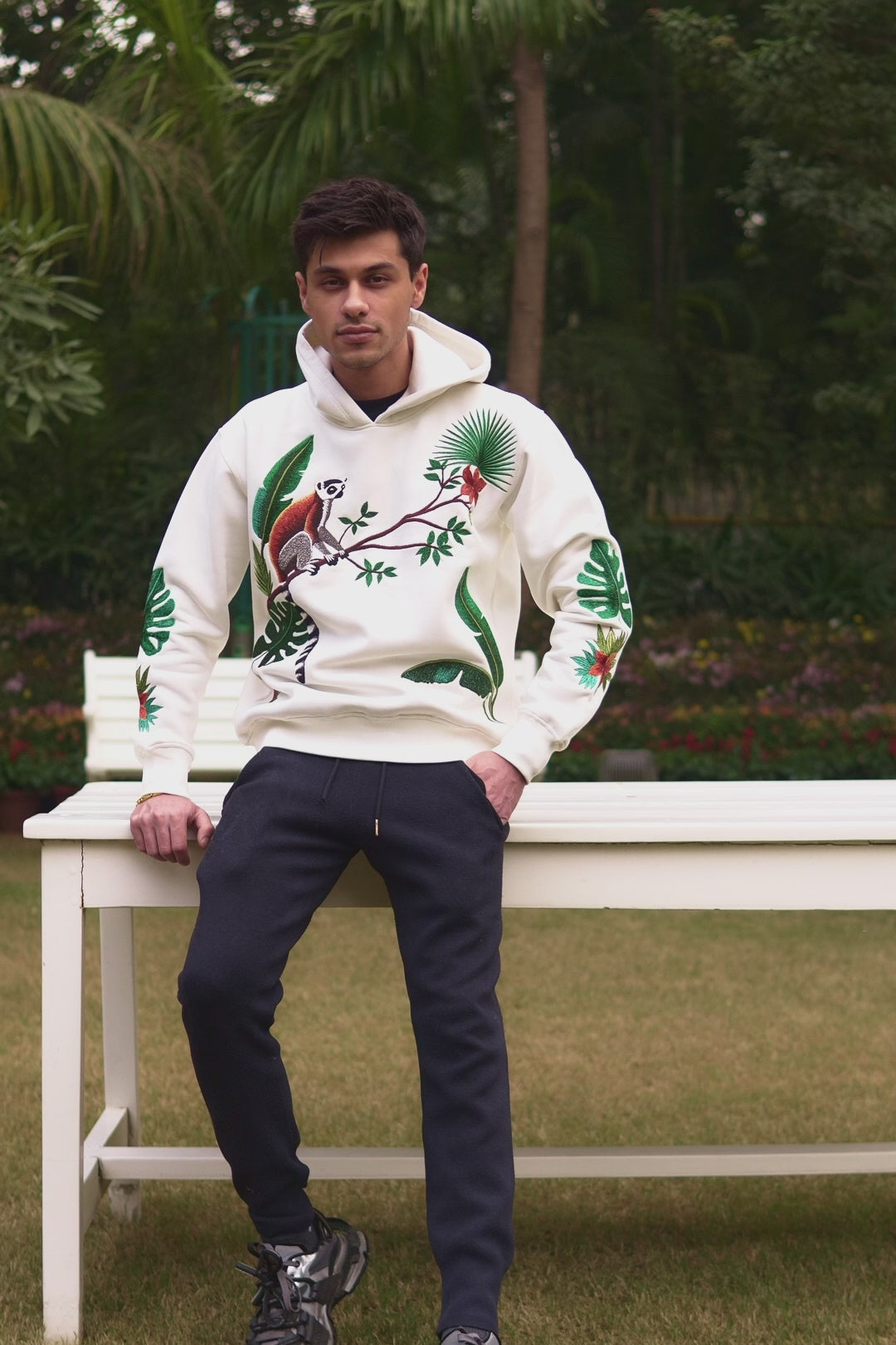 Embrace the wild with our Tropical Escape Hoodie, the perfect choice for nature enthusiasts. This design features intricate handcrafted embroidery of a ring-tailed lemur perched on a branch amidst lush tropical foliage, including vibrant monstera and banana leaves accented by bold orange blossoms. The earthy tones and detailed craftsmanship make this hoodie a standout piece, combining rugged charm with modern style. Designed for men, it balances comfort with an adventurous spirit, making it ideal for exploring the outdoors or elevating your casual wardrobe.